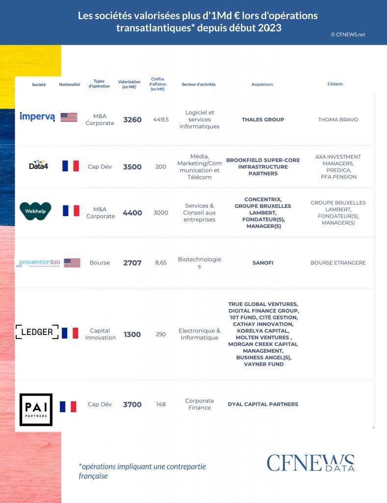 Les sociétés valorisées plus d'1Md € lors d'opérations transatlantiques* depuis début 2023 © CFNEWS.net