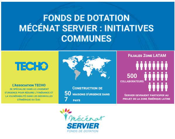 Le Fonds de dotation Mécénat Servier a lancé en 2018 le premier appel à projet filiales pour des initiatives communes internationales avec comme objectif d’apporter un soutien financier à des associations d’intérêt général internationales tout en mobilisant les collaborateurs des filiales du groupe français sur un projet d’engagement à long terme. Après avoir reçu dix projets, le comité de sélection du Fonds de dotation a retenu ceux de ses filiales de la zone LATAM avec l’association Techo et de sa filiale Russe avec la fondation Arithmetic of Good pour leur approche innovante à venir en aide aux communautés locales. L’association Techo se spécialise dans les programmes de logement d'urgence qui visent à réduire l'itinérance et la vulnérabilité dans les bidonvilles du continent sud-américain. Leur programme a pour ambition de sortir de la précarité les familles et les communautés vivant en situation d'extrême pauvreté dans 19 pays. Le projet d’initiative commune avec Mécénat Servier financera la construction de 50 maisons d'urgence dans 7 pays où Servier est présent, le Brésil, l'Amérique centrale et Caraïbes, le Mexique, l'Argentine, la Colombie, l'Équateur et le Pérou. Les collaborateurs de ces filiales auront l'occasion de s'impliquer directement en se portant volontaire pour construire une maison pendant un week-end. La construction d’une habitation demande la mobilisation de 10 bénévoles sur deux jours complets. Après quoi, les collaborateurs remettront les clés à la famille qui résidera dans la maison qu'ils auront construite. Environ 500 collaborateurs Servier issus des 7 filiales mobilisées devraient participer à cette initiative, ce qui représente 30 % de l'effectif total de la zone Amérique Latine.