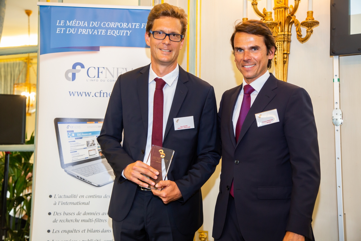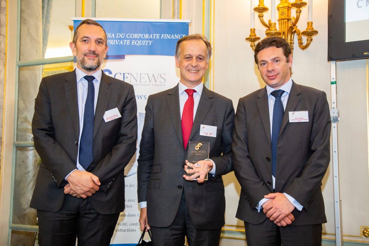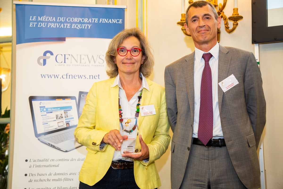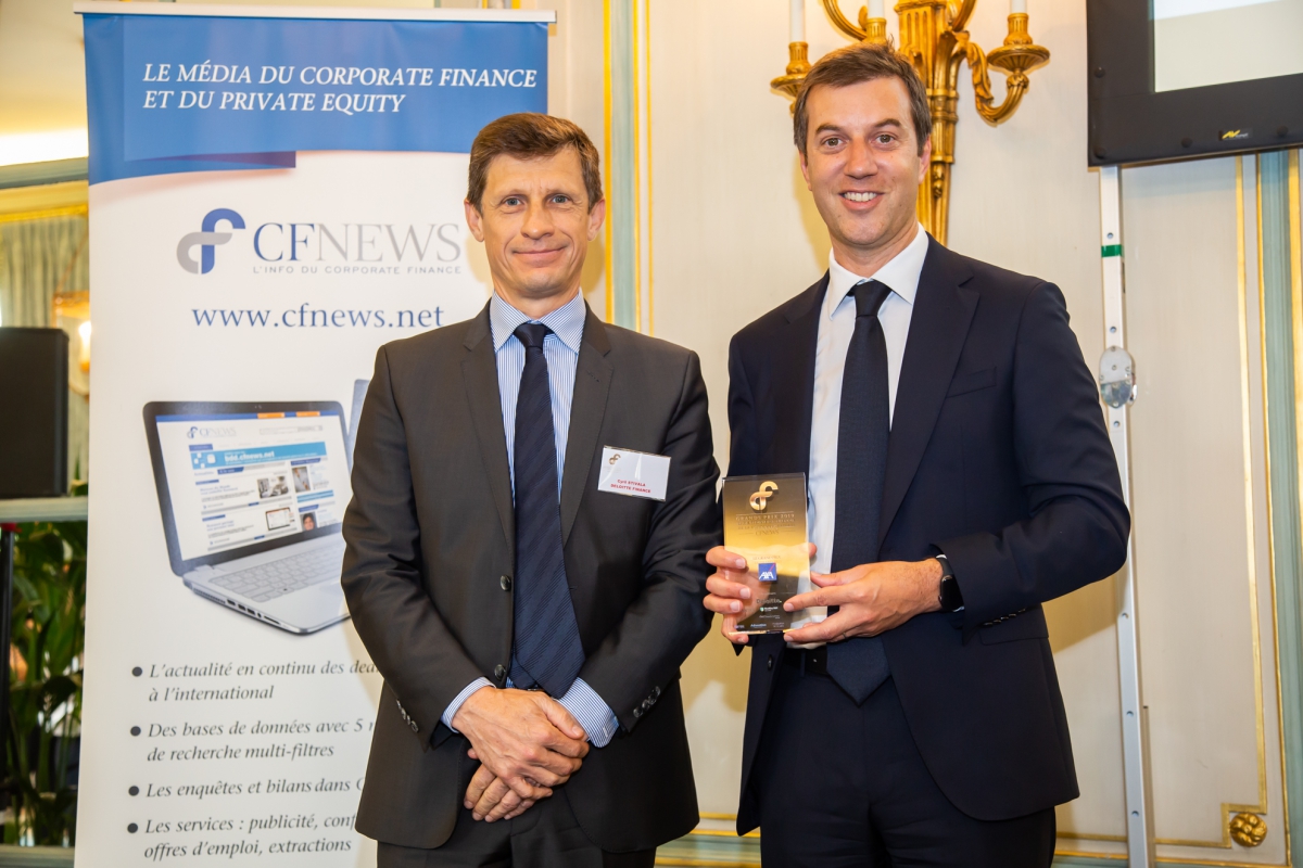 Trophée remis à Nicolas Leclercq (à droite) Head of Corporate Finance and Treasury de GROUPE AXA par Cyril Stivala (à gauche), Associé - Deloitte