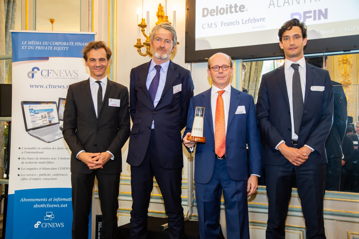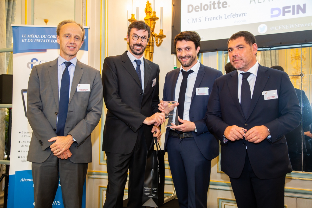 Trophée remis à Nicolas Brodetsky (3ème en partant de la gauche), CEO de HAVEA GROUP et à Matthieu Mourette (2ème en partant de la gauche), Head Projects and Development de HAVEA GROUP par Rodolphe de Kesling (extrême gauche) Senior Advisor - Neuflize OBC et David de Pariente (à l'extrême droite) Avocat Associé, Gordon S. Blair.