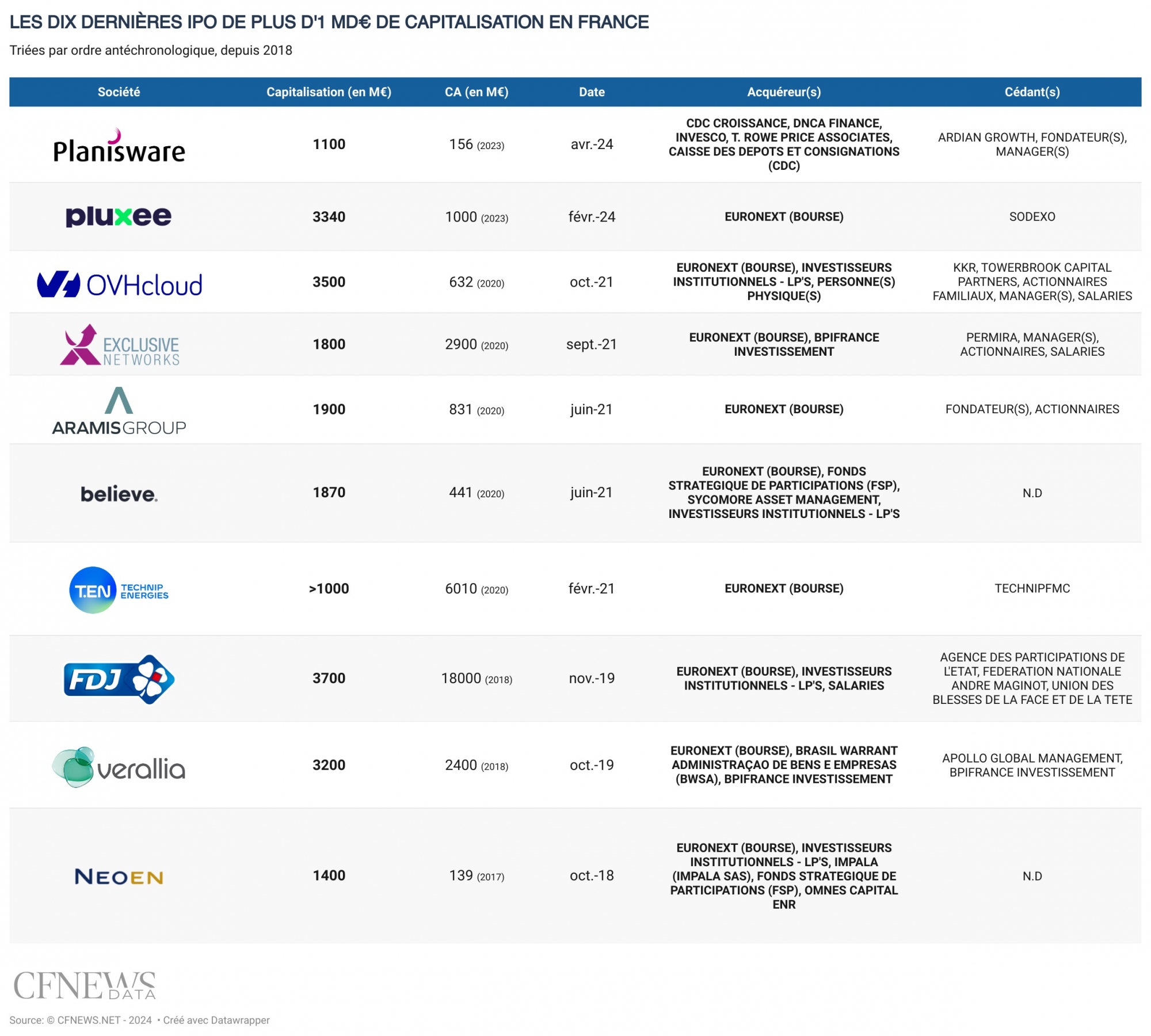 La Sicav CDC Tech Premium, de la Caisse des Dépôts, s'engage à nouveau à injecter 25 M€ pour son premier investissement, un ticket sur lequel se sont également positionnés DNCA Finance, le britannique Invesco et l'américain T. Rowe Price International. L'opération, dont le livre est tenu par BNP Paribas, Citigroup, BofA Securities Europe SA et Joh. Berenberg, Gossler & Co. KG, compte aussi une option de surallocation de 2 262 750 actions, d'une valeur de 36 M€. [Mise à jour du 22/04/24 : l'intégralité de l'option de surallocation pour 36 M€ a été exercée, portant le montant final de l’opération à 278 M€.] La période de souscription prendra fin dès demain. A l'issue de l'opération, les fondateurs resteront majoritaires au capital. Pour les dirigeants, les objectifs de cette introduction, outre la cession d'Ardian, étaient de conserver l'indépendance et de gagner de la visibilité, pour faire face à des concurrents tels que l'australien Atlassian ou encore l'américain Planview. Le spin-off de Thalès en 1996, présidé par Pierre Demonsant et salariant 700 personnes, a réalisé 156 M€ de chiffre d'affaires en 2023, pour un Ebitda de 52 M€, soit une marge d'Ebitda de 33 %. Ces chiffres en croissance auraient contribué à susciter l'appétit des investisseurs selon la société. Réalisant 49 % de ses revenus en Europe, le groupe implanté dans dix pays compte 545 clients dans une dizaine de secteurs dont l'automobile, la défense et l'aérospatial et les sciences de la vie.