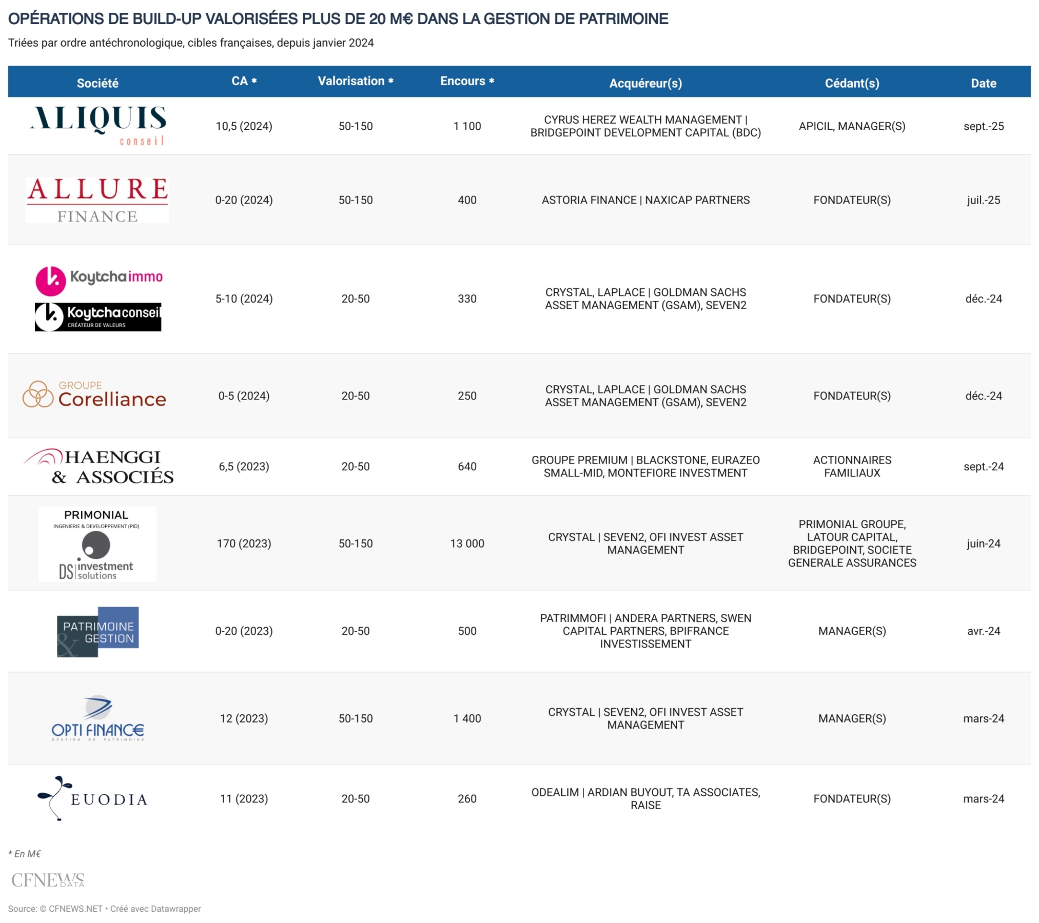 Les grandes manœuvres se poursuivent pour Cyrus-Herez. Le conseil parisien en gestion de patrimoine fort de 165 M€ de revenus 2024 a refinancé sa dette en juin dernier en levant une nouvelle unitranche auprès d’Ardian. Le processus de vente du groupe, jusque-là contrôlé à hauteur de 20 % par Bridgepoint Development Capital se poursuit. Orchestré par Rothschild & Co, il pourrait aboutir d’ici début 2026 avec l’entrée d’un fonds majoritaire, alors que cet acteur est jusque-là détenu par plus de 250 collaborateurs emmenés par les deux co-présidents, Meyer Azogui et Patrick Ganansia. En parallèle, Cyrus-Herez continue d’alimenter sa stratégie de croissance externe. Il vient de signer l’acquisition de 100 % d’Aliquis Conseil. Cette opération est principalement menée auprès d’Apicil, qui détenait 72 % de cet acteur originaire d’Oyonnax et implanté dans 10 autres villes de métropole et d’Outre-mer. Le solde du capital était aux mains des associés historiques Guillaume Sereaud, Pierre Bertrand et Xavier Valière-Vialeix, qui rejoignent Cyrus-Herez.