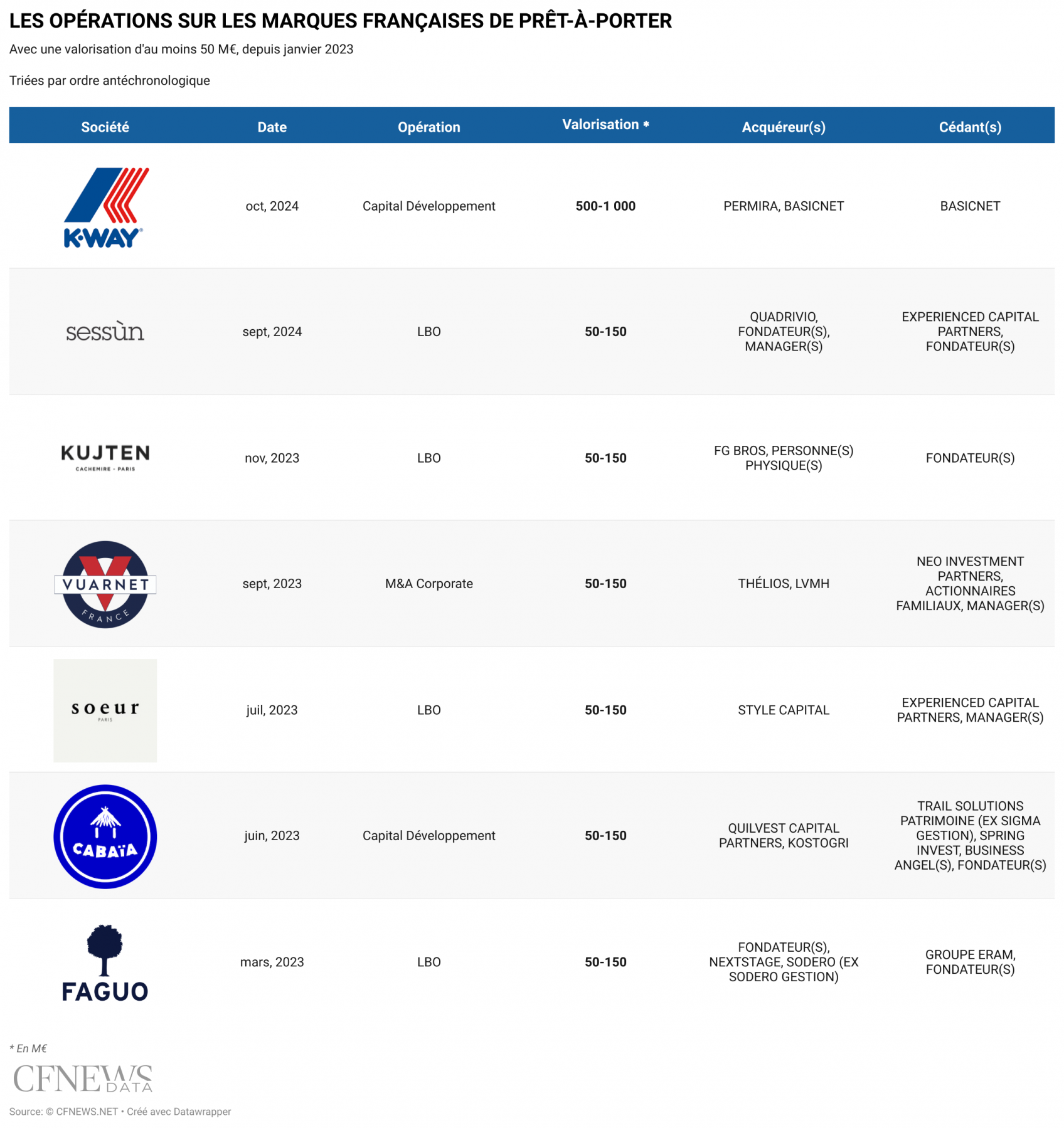 L’investisseur britannique investit un ticket de près de 190 M€ pour détenir 40 % du capital de K-Way, via son fonds Permira Growth Opportunities II, valorisant l’entreprise précisément 505 M€ soit plus de 11 fois l’Ebitda de près de 45 M€ de la marque qui affiche des revenus de près de 150 M€. Le groupe BasicNet, piloté par la famille Boglione, garde la majorité avec 60 % du capital, pour profiter du potentiel de croissance encore important de la belle endormie, qui avait périclité à une dizaine de M€ de revenus au moment de sa reprise il y a 20 ans. Le duo formé par Alessandro et Lorenzo Boglione, artisan de la renaissance de la marque, a su remettre le K-Way dans l’air du temps avec l’innovation technique et le confort qui faisaient défaut à son ancêtre. À la tête d’une centaine de boutiques, la marque revend aussi ses collections chez des partenaires multi-enseignes et a su jouer sur la nostalgie du modèle basique qui a fait son succès dans les années 80, rebaptisé veste Claude en hommage à son inventeur en 1965 Léon Claude Duhamel.