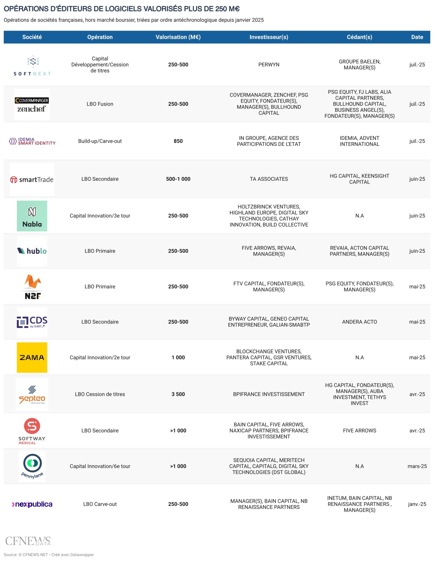 « En réalisant pas moins de 30 rachats entre 2020 et 2024 [pas tous annoncés, ndlr], et quatre depuis le début d'année, SoftNext a montré un modèle d'acquisitions très efficace. Celui-ci repose sur un réseau d'apporteurs d'affaires générant un flux de dossiers significatif, et sur des dirigeants cédants assurés de ne pas voir leur société revendue et restant autonomes tout en profitant de synergies avec les autres éditeurs du groupe », décrit Mathieu Antonini, associé en charge de la France chez Perwyn. L'activité réunit 600 personnes pour un chiffre d'affaires de l'ordre de 100 M€ et 30 M€ d'Ebitda sur les douze derniers mois. La dernière entreprise à avoir rejoint la filiale de Baelen est Optimizr, dont les logiciels s'adressent aux compagnies aériennes et agences de voyage. Les acteurs spécialisés dans les acquisitions de petits éditeurs ne manquent pas en France, avec Orisha, Septeo et Comet Software (Otium) parmi d'autres, ou au-delà des frontières comme le pionnier canadien Constellation Software ou le plus jeune Everfield Software très présents dans l'Hexagone. « SoftNext a bénéficié d'exemples d'autres acteurs. Dans ce métier d'empilement d'Ebitda, ils ont prouvé leur savoir-faire dans l'exécution de la stratégie », commente une source proche du dossier.