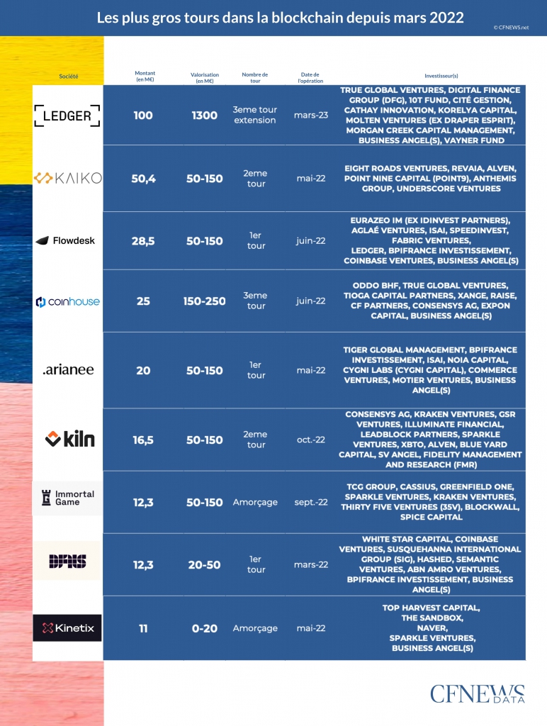 Ledger revendique la sécurisation de plus de 20 % des cryptomonnaies et 30 % des NFT dans le monde, et de fait, une avance Gafamesque par rapport à ses concurrents positionnés sur les clés physiques. Le concepteur de multiples portefeuilles de cryptoactifs, qui s'est diversifié à travers des services d'assurance ou encore de gestion, s'était élevé au rang de licorne à l'occasion d'une levée de 312 M€ à l'été 2021. La société francilienne conserve cet attribut lors d'un nouveau tour de 100 M€, « correspondant à une extension car répondant aux mêmes logiques que la précédente opération : on a notamment repris le même term sheet », note Pascal Gauthier. Trois nouveaux fonds, spécialisés en web 3.0, font leur entrée, avec en tête le singapourien True Global Ventures (22 M€), fondé par une quarantaine d'associés et dont le bouclage à 110 M$ remonte à 2021. Il est suivi de son voisin Digital Finance Group et de l'américain VaynerFund.