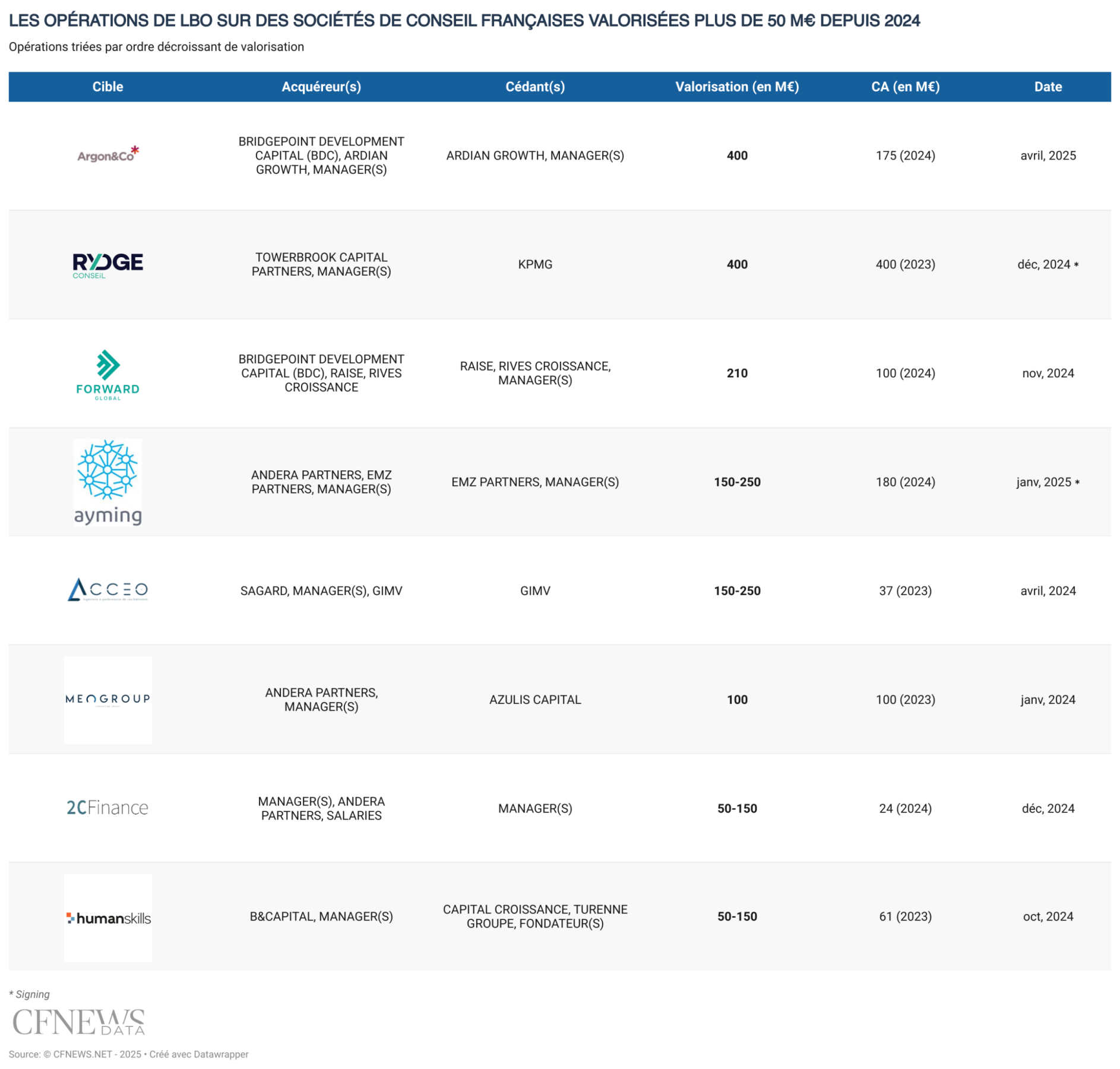 LES OPÉRATIONS DE LBO SUR DES SOCIÉTÉS DE CONSEIL FRANÇAISES VALORISÉES PLUS DE 50 M€ DEPUIS 2024 ©CFNEWS-2025