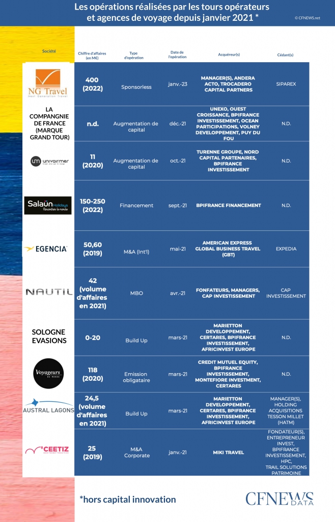 La crise du Covid n’a finalement pas ralenti NG Travel dans sa trajectoire. Lorsqu’en 2018, le tour-opérateur fait entrer Siparex, à hauteur d’environ 30% du capital, pour réorganiser son actionnariat autour d'Olivier Kervella, l’un des fondateurs, l’ambition était de franchir les 400 M€ de chiffre d'affaires en quatre ans. La mission a été réussie puisque ce seuil a été dépassé en 2022 alors que les revenus du groupe s’élevaient à 185 M€ en 2017. « Les objectifs du plan stratégique ont été atteints. La reprise du tourisme s’étant confirmée l’année dernière, ouvrant l’opportunité pour NG Travel de franchir une nouvelle étape, le moment  était opportun pour initier une sortie » indique Antoine Fustier, directeur d’investissement chez Siparex. Le process, piloté par D&A, également à la manœuvre lors du MBO primaire, aboutit à une opération sponsorless orchestrée par Andera Acto qui valoriserait le groupe entre 100 et 200 M€, selon nos informations. Le fonds, qui s’était déjà penché sur le dossier en 2018, réaffirme ici son intérêt pour le secteur du tourisme, après son investissement dans l’éditeur de logiciels pour les voyagistes Travelsoft. Via son quatrième véhicule et Acto Heritage, il mise un ticket de l’ordre de 40 M€ aux côtés de Trocadero Capital Partners, qui injecte environ 20 M€, avec une enveloppe composée très majoritairement d‘OBSA. Les deux financiers s’octroient également une petite part du capital, tandis que le management, qui détenait 70 % des titres, se relue « significativement ». Enfin, Zencap renouvelle son engagement via une nouvelle dette unitranche.