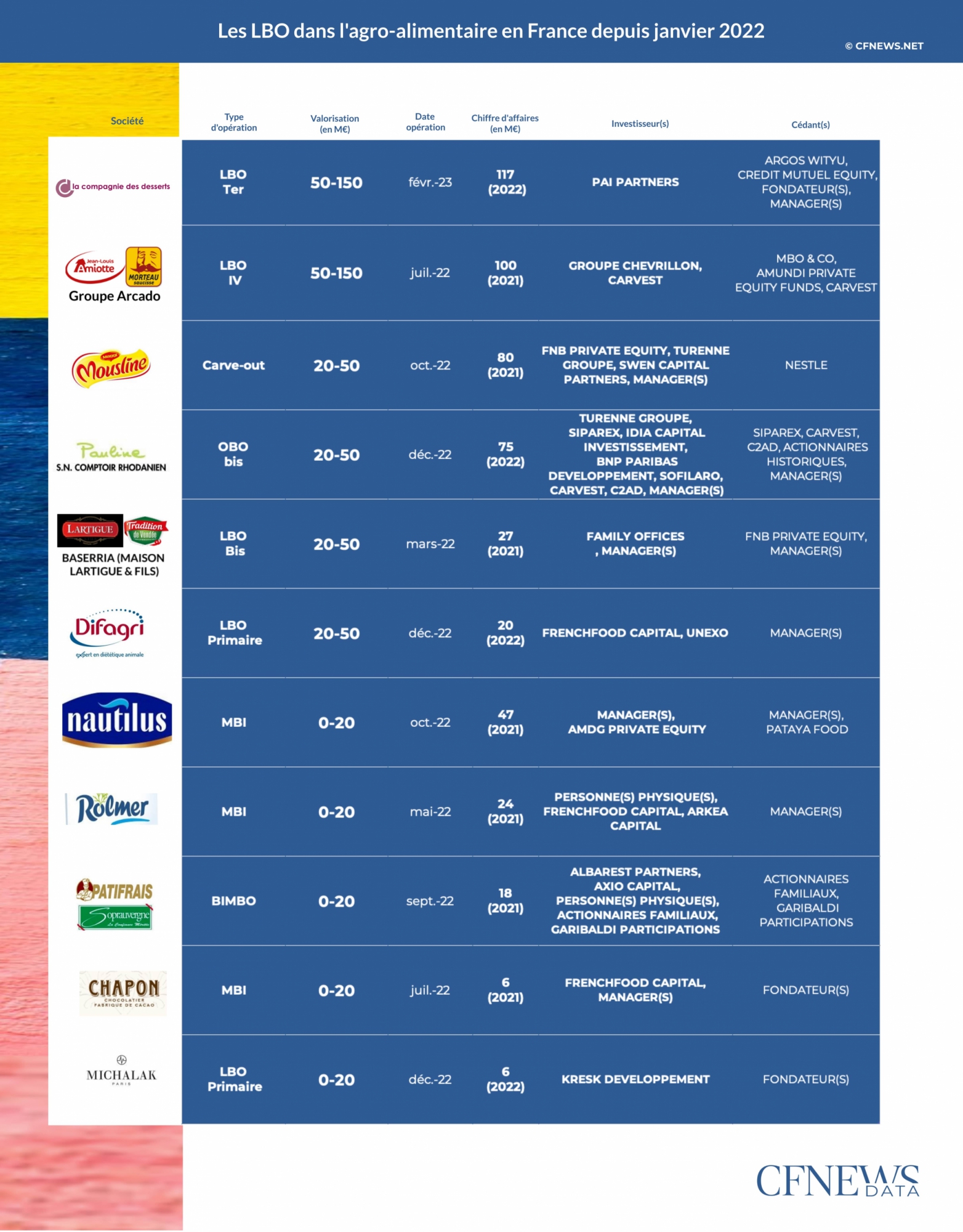 Depuis l'entrée à son capital d'Argos Wityu en 2016, La Compagnie des Desserts a vu son effectif et son chiffre d'affaires plus que doubler. C'est donc un ensemble de 117 M€ de ventes et près de 750 personnes spécialisé dans la fabrication de desserts surgelés haut de gamme pour le marché des services de restauration que s'apprête aujourd'hui à reprendre PAI Partners via son fonds Mid Market - lancé en 2021 et désormais fort de six participations - dans le cadre d'un troisième LBO. Crédit Mutuel Equity, actionnaire de la société à hauteur de 20 % aux côtés d’Argos Wityu (qui avait mis la main sur 70 % des titres il y a sept ans), cède également la totalité de sa participation, après avoir accompagné depuis 2005 la famille Barral, fondatrice de l'entreprise. L'opération, conseillée par Alantra et financée par Cerea, selon nos informations, serait réalisée sur la base d'une valorisation comprise entre 100 et 150 M€ sur la base de 9 à 10 fois l'Ebitda. Elle permettrait, toujours selon nos sources, à Argos Wityu de réaliser un multiple de sortie de l'ordre de 3,1.