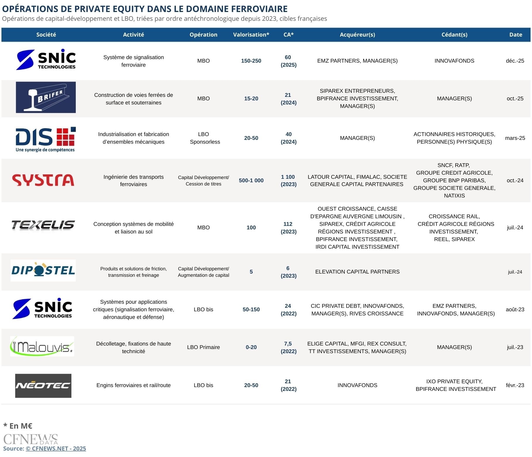 « Le monde du ferroviaire est dominé par quelques grands noms mais il y a de la place pour des acteurs indépendants qui peuvent jouer un rôle d’animation sur ces marchés de maintenance et renouvellement d’infrastructures. Les barrières à l’entrée sont fortes et il y a des opportunités de croissance externe à aller chercher, en Europe, notamment en Allemagne », indique Charles Mercier, directeur associé senior chez EMZ Partners. Snic Technologies est déjà présent en France, qui représente encore la moitié de son activité, en Espagne, au Royaume-Uni et au Chili. Employant plus de 170 collaborateurs, le fabricant d’équipements pour la signalisation ferroviaire basé à Bonneuil-sur-Marne a généré 60 M€ de chiffre d’affaires en 2025.
