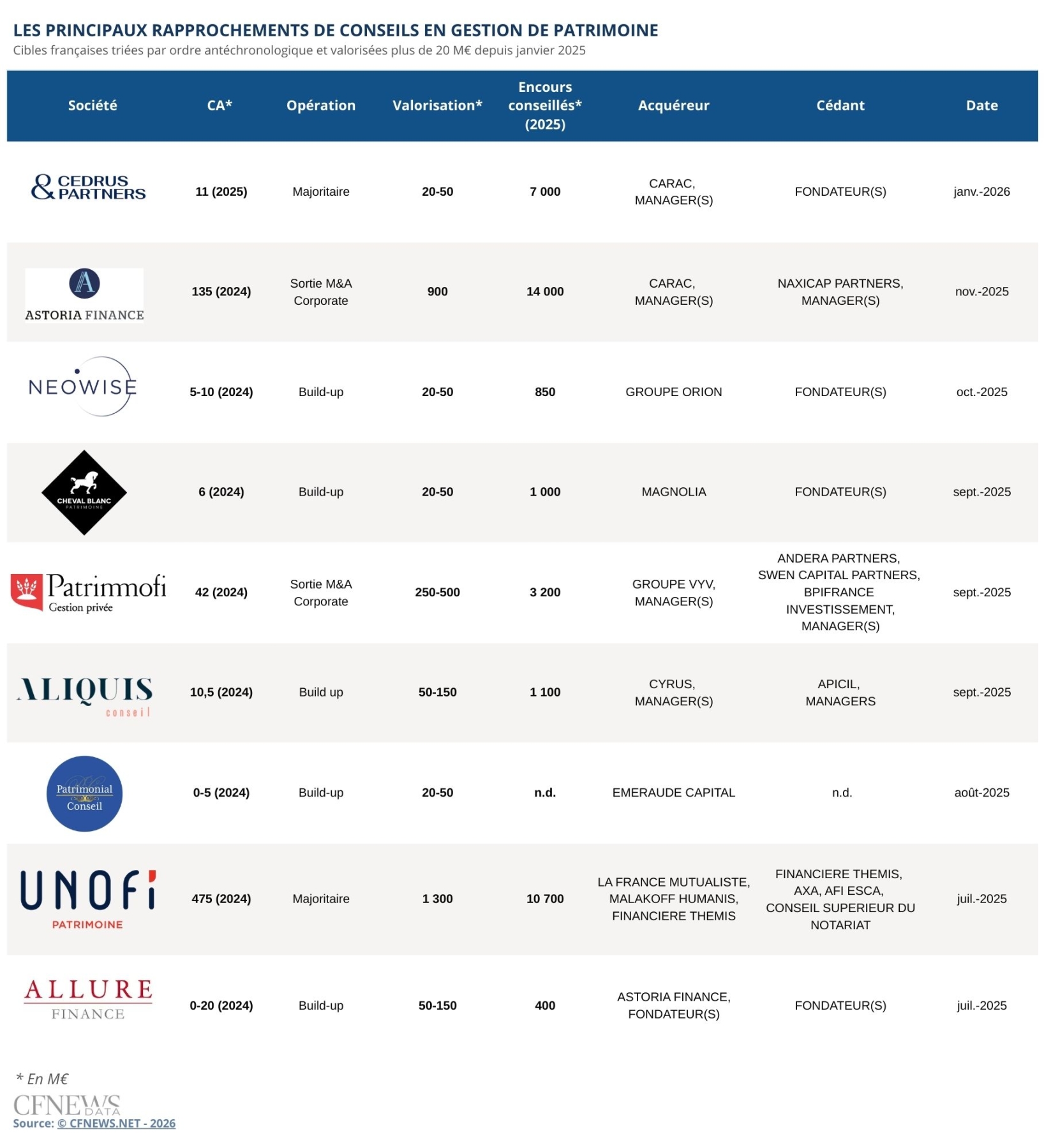 Créé en 2010 comme conseil en investissements financiers pour les holdings familiales, associations et fondations, Cedrus & Partners a mué en 2020 en entreprise d’investissement pour sa clientèle privée. Il conseille près de 6 Md€ d’actifs et cumule 500 M€ d’actifs sur ses fonds de fonds. Son cinquième millésime Private Stars Selection V a réuni 75 M€ de souscriptions, pour lequel il entend lever 120 à 150 M€. Avec une équipe d’une trentaine de professionnels, Cedrus Partners génère un peu plus de 10 M€ de chiffre d’affaires et tutoie les 30 % de marge d’Ebitda d’après nos informations. La signature de l’opération, qui devrait se boucler dans les prochaines semaines, suit celle du rachat du groupe de conseil et gestion de patrimoine Astoria par la Carac. La mutuelle des anciens combattants était également entrée au capital d’Atream en 2024. Dirigée par Michel Andignac, la Carac affiche 1,4 Md€ de chiffre d’affaires en 2024, en croissance de 81 %, et 500 salariés à travers son réseau d’une cinquantaine d’agences et sites.