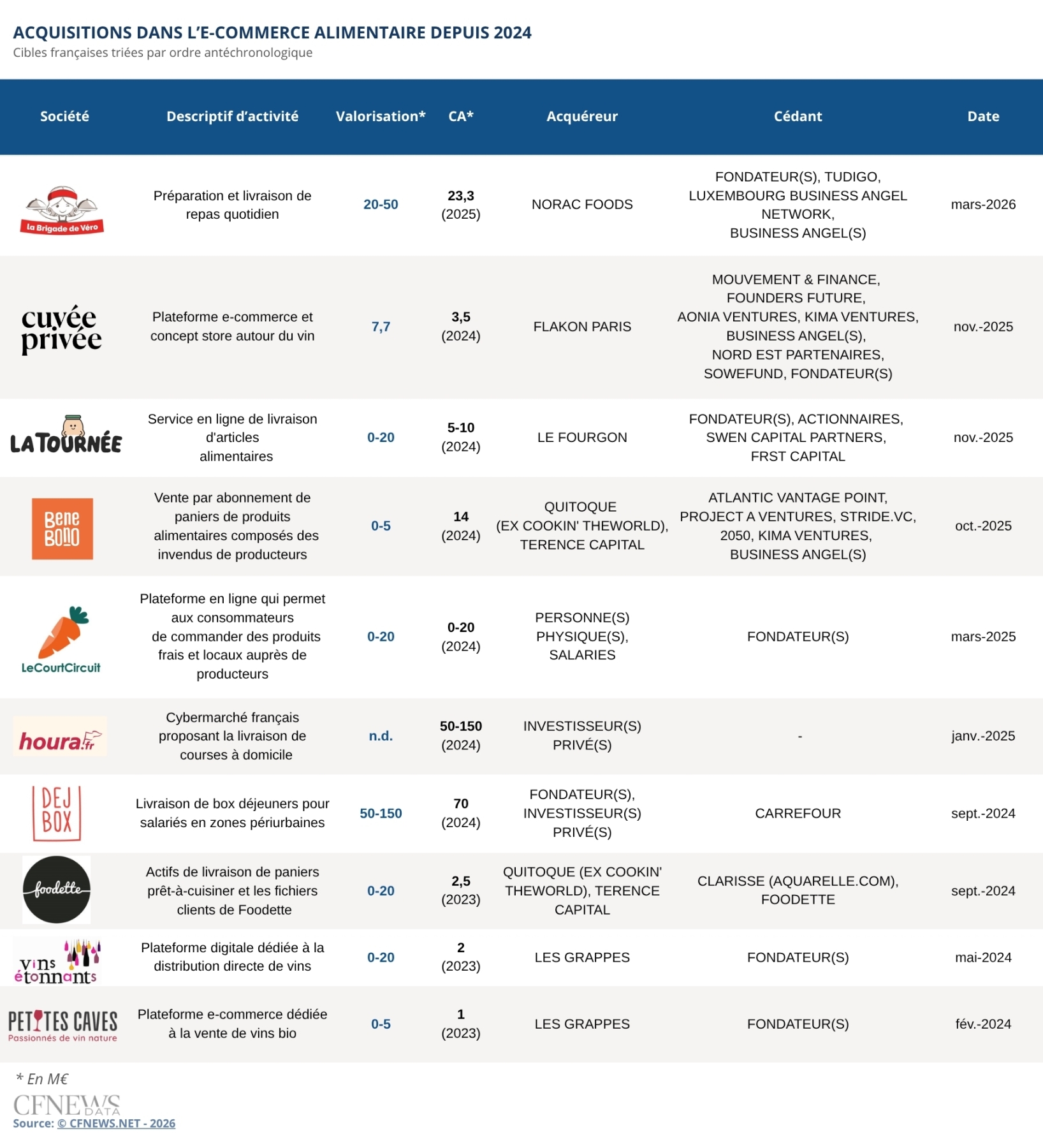 La Brigade de Véro rejoint les fourneaux d'un industriel agro-alimentaire breton. La société montpelliéraine lancée il y a dix ans par Véronique Capon et son fils Arthur, spécialisée dans la préparation et la livraison de repas équilibrés frais, est acquise par Norac Foods. Exploitant les marques Daunat, La Boulangère ou Wahoo !, l'industriel prend 80 % du capital dont le solde reste aux mains de la famille Capon, du directeur général Romain Roques qui devient président exécutif de la cible, et de deux managers. Ces cinq personnes disposent d'une clause de sortie dans cinq ans. Véronique Capon reste opérationnelle au contraire de son fils Arthur ayant pris du recul il y a un an. Edmond de Rothschild Corporate Finance a orchestré un processus dual track depuis mars 2025 en contactant une vingtaine d'acteurs. L'opération acte la sortie de trente business angels, dont le promoteur immobilier Pierre Thomas, entrés lors d'une levée de 2,3 M€ il y a cinq ans, en partie sur la plateforme Tudigo, complété par plusieurs membres du réseau Luxembourg Business Angels Network. La marque La Brigade de Véro est conservée.