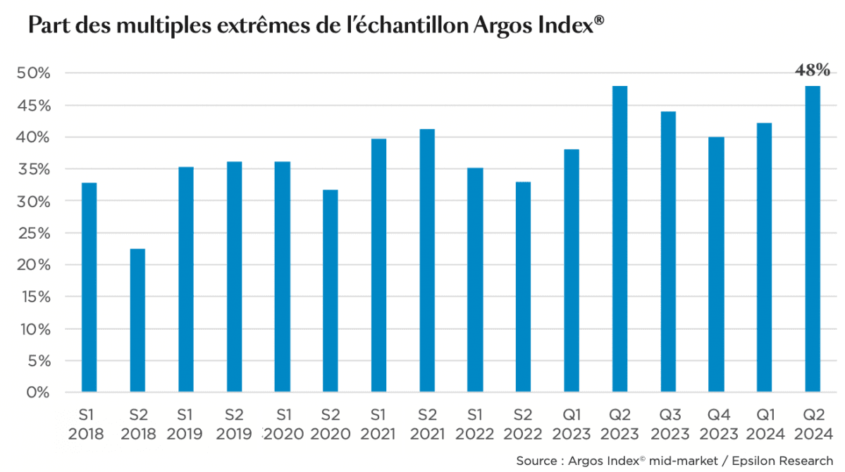 Pause dans la descente. L’évolution des multiples de valorisation du mid-market reste atone au deuxième trimestre 2024 d’après l’Argos Index, qui recense les transactions réalisées entre 15 et 500 M€ de valeur d’entreprise dans la zone euro, la France représentant 20 % de cet échantillon. « L’indice affiche une stabilité parfaite à 8,9 fois l’Ebitda après cinq trimestres de baisse, marqués par la hausse des taux d’intérêt et l’incertitude sur leur évolution, commente Louis Godron, président d’Argos Wityu. La perspective s’est retournée et le consensus attend plutôt une baisse tranquille. » La continuité avec le trimestre précédent se retrouve également dans la polarisation des transactions au sein du mid-market qui se confirme. Les multiples extrêmes atteignent leur niveau le plus élevé depuis 2018 et représentent près de la moitié, 48 %, des deals, tiré par les opérations réalisées à moins de 7 fois l’Ebitda (31 %) et entre 15 et 20 fois (17 %).