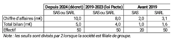 Cependant, son usage ne s’est pas encore généralisé dans les transactions du small cap, en particulier dans les opérations primaires. Le besoin est pourtant réel. Il tient d’abord à la qualité de l’information financière que l’on trouve dans les sociétés de taille petite ou moyenne. L’information analytique y est peu, voire pas, développée. La comptabilité statutaire est marquée par l’empreinte de la fiscalité. Le respect des règles comptables n’est pas toujours assuré. Rappelons que les seuils de nomination d’un commissaire aux comptes ont été significativement relevés au cours des dernières années, comme le montre le tableau ci-dessous :