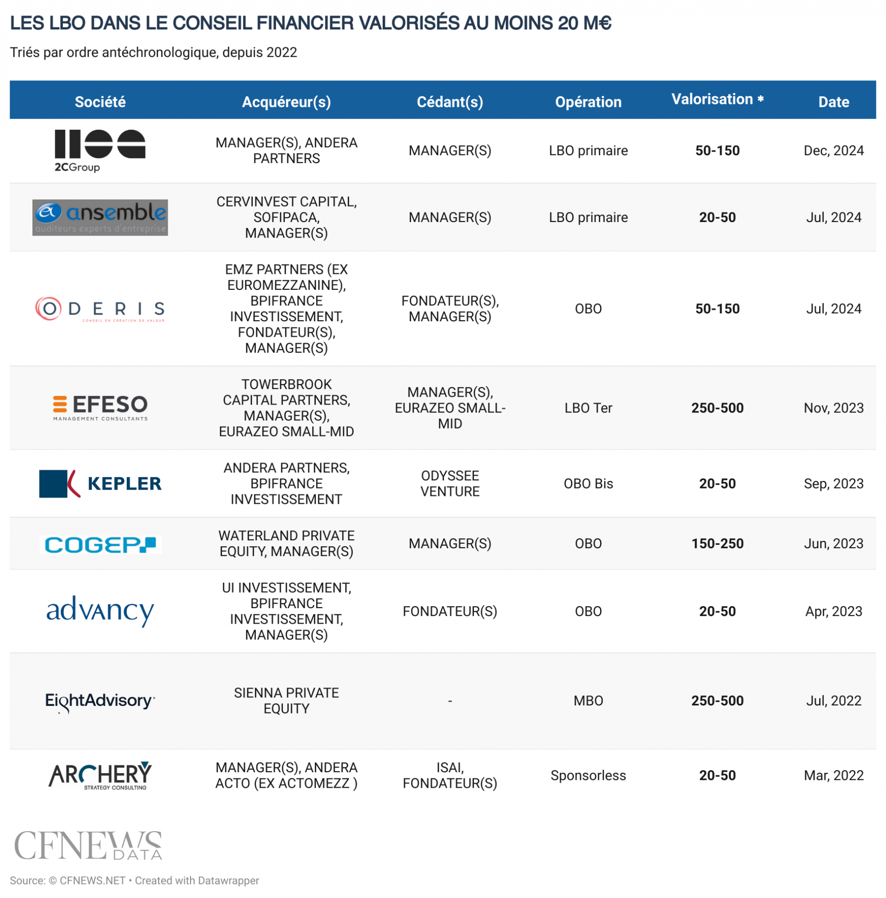 Habitué à apparaître dans les opérations de capital-investissement en tant que conseil, 2CGroup devient pour une fois acteur. Le groupe de direction partagée (finance, RH, marketing, ESG), d'audit financier et de conseil en financement de l'innovation, né sous le nom de 2CFinance en 2008, fait l'objet d'un LBO avec Andera Partners. L'investisseur entre en minoritaire, à hauteur de 30 % selon nos informations, via Andera Croissance dont les tickets en equity vont jusqu'à 15 M€. Ce véhicule doté de 80 M€ depuis 2020 s'approche de la fin de son déploiement avec encore une ou deux lignes à écrire. Le trio d'associés composé de Benjamin Bitton (43 ans), managing partner, Jacques Haccoun (43 ans), en charge de la partie transaction services, et Thomas Lacôte (42 ans), dirigeant l'offre de direction à temps partiel, réalise un peu de cash-out mais reste plus que jamais aux commandes, et fait une place au capital à une vingtaine de cadres clés. La dette senior classique de ce LBO primaire, au levier inférieur à 3, provient de LCL, BNP Paribas et Bred Banque Populaire. La transaction, bouclée ce matin, valorise le groupe au-delà de 50 M€, selon nos informations.