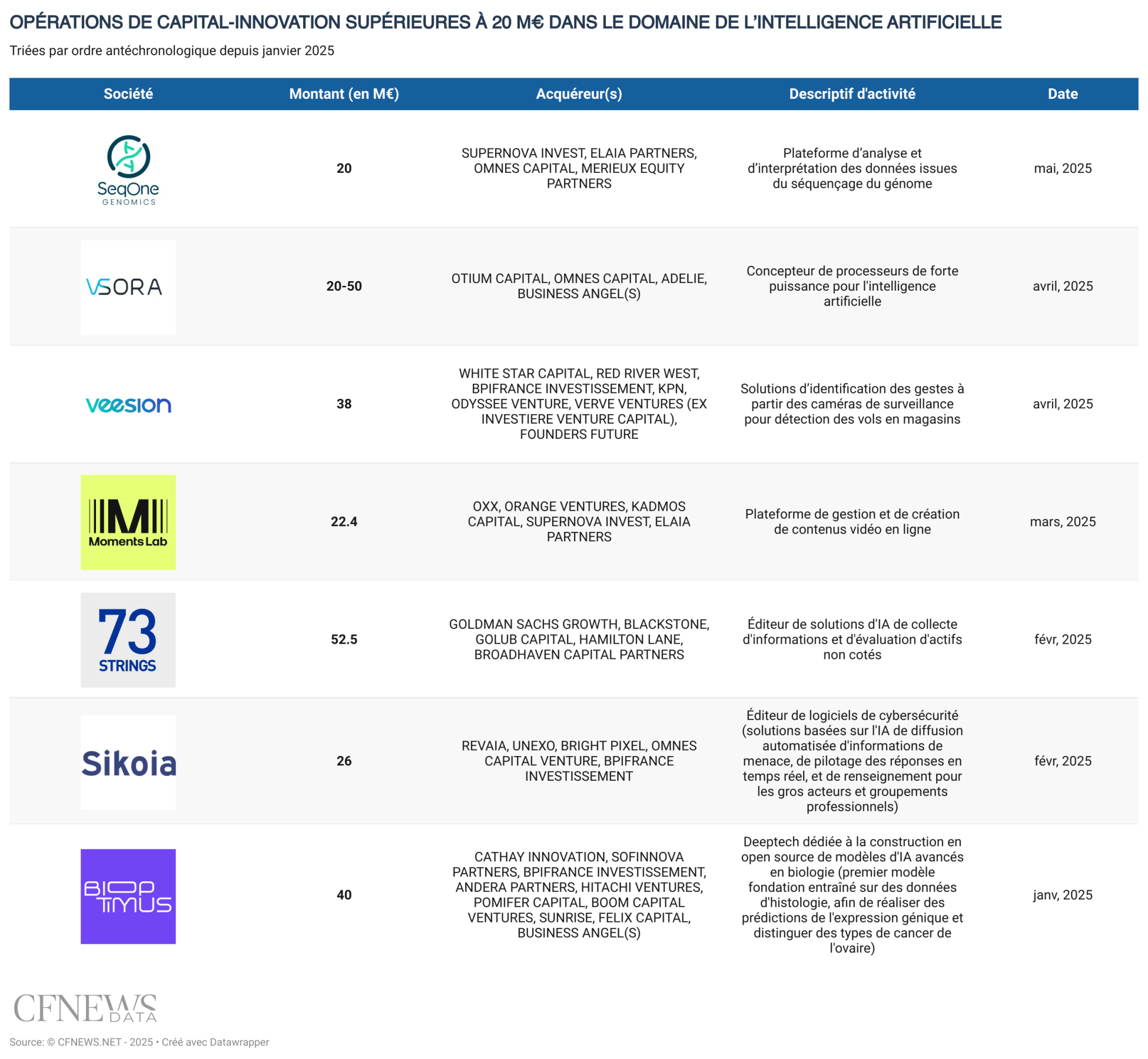 Moments Lab a bouclé fin mars une série C pour poursuivre sa conquête de l'Amérique, entamée par l'ouverture d'un bureau new-yorkais il y a dix-huit mois et un changement d'identité de marque en 2024. Deux ans et demi après un tour de 7 M€ auprès de Supernova Invest et Elaia, la société, anciennement dénommée Newsbridge, éditant une solution alimentée par l'intelligence artificielle analysant et décomposant les vidéos en scènes significatives, lève 24 M$ (22,4 M€). Après avoir mandaté la banque d'affaires UBS, à l'automne, l'entreprise accueille le britannique Oxx en tant que meneur, injectant pour plus de la moitié du montant, et les deux autres entrants Orange Ventures et le londonien Kadmos Capital. Les historiques Elaia et Supernova Invest remettent au pot dans une opération valorisant la société fondée par les frères Philippe et Fredéric Petitpont dans une fourchette comprise entre 75 et 80 M€, selon nos informations.